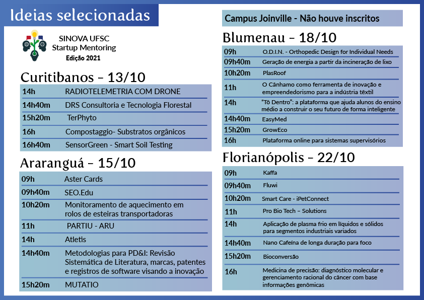 O projeto recebeu 45 inscrições de ideias inovadoras, sendo selecionadas 28 ideias foram selecionadas para as mentorias, sendo 08 ideias de Blumenau, 08 ideias de Florianópolis, 07 ideias de Araranguá e 05 ideias de Curitibanos. Não houve inscritos do campus Joinville nesta edição do projeto. Confira a lista de selecionados e horários das mentorias: